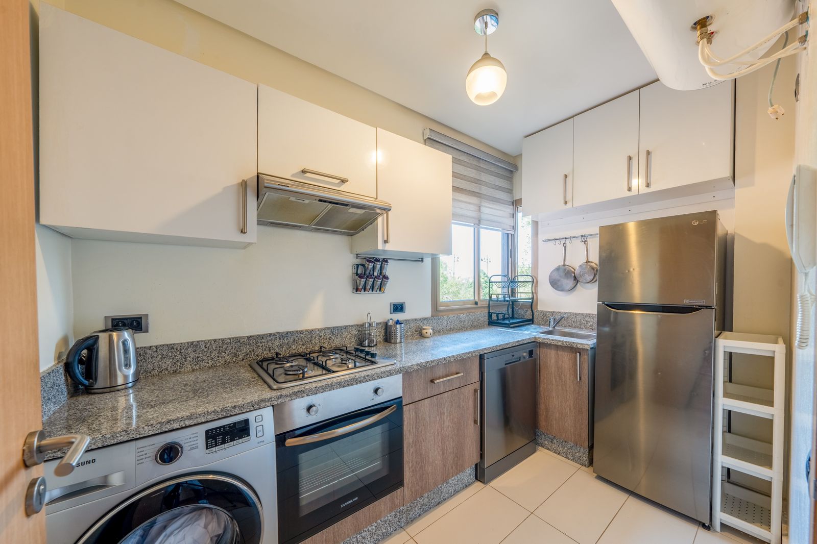 Four, plaques, réfrigérateur, machine à café et ustensiles complets pour cuisiner en toute simplicité.