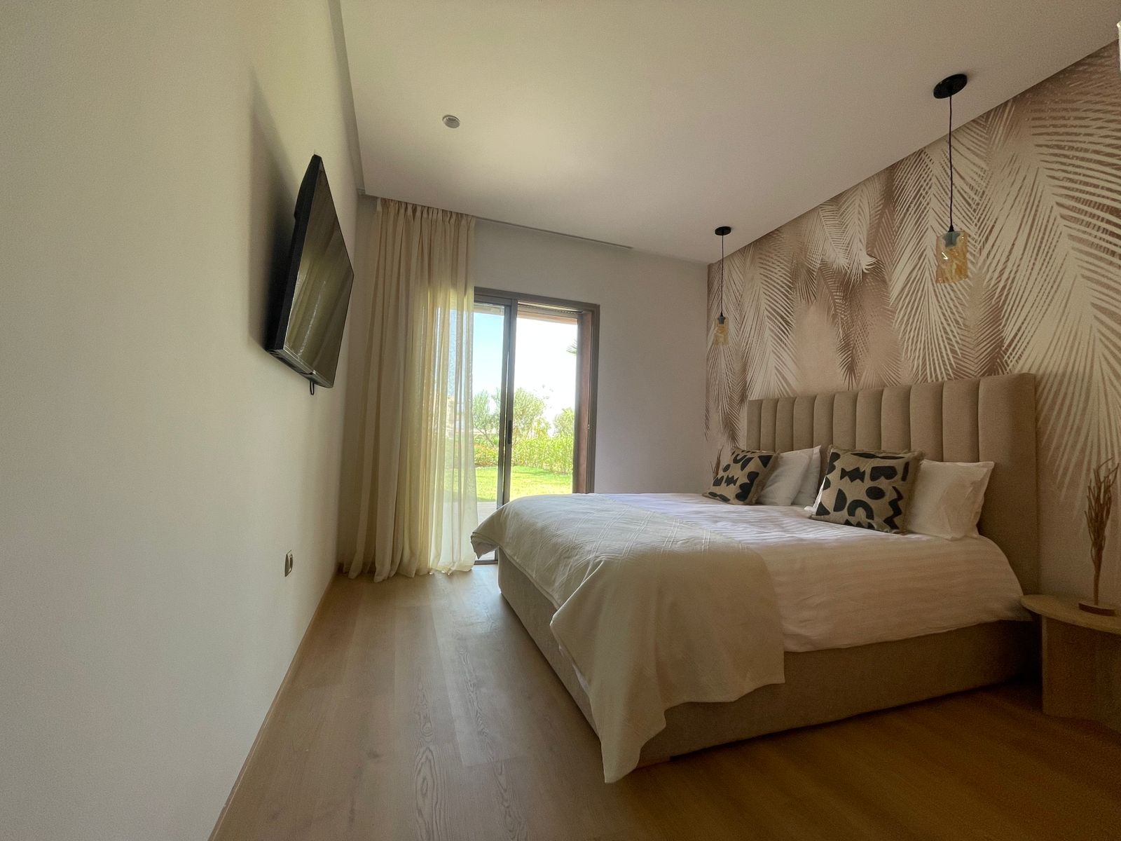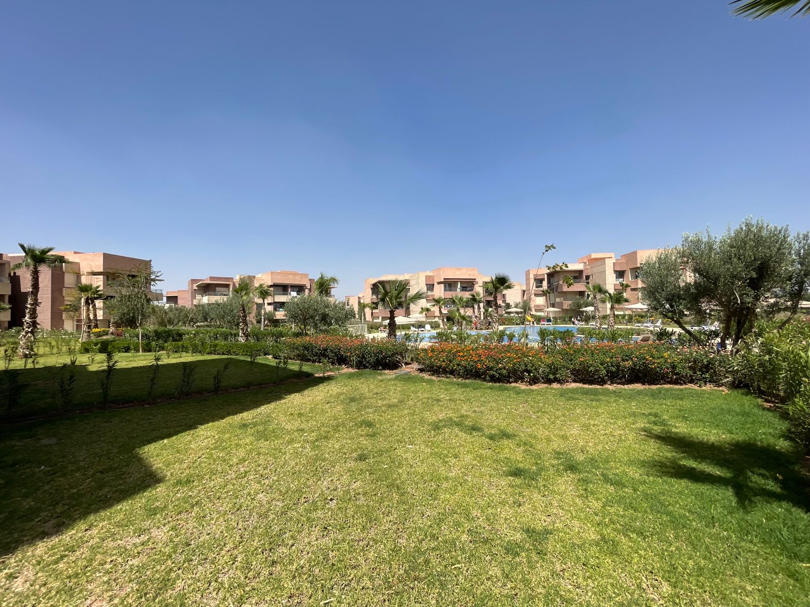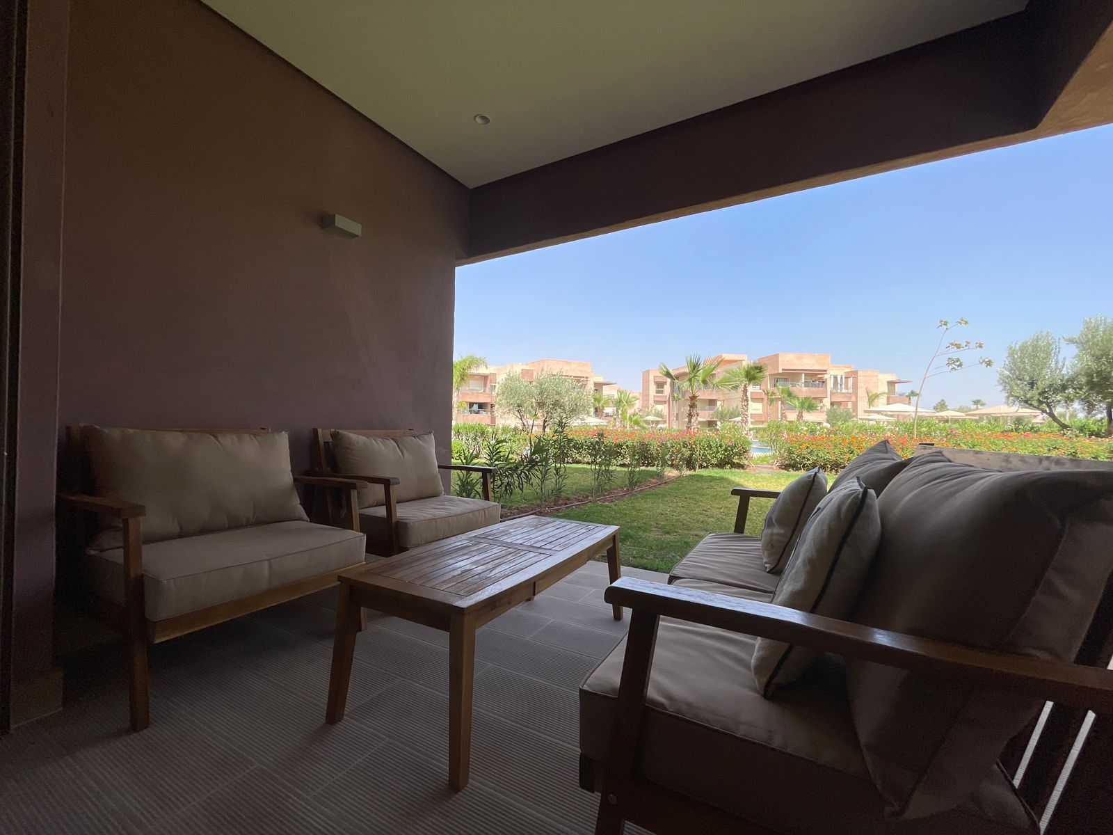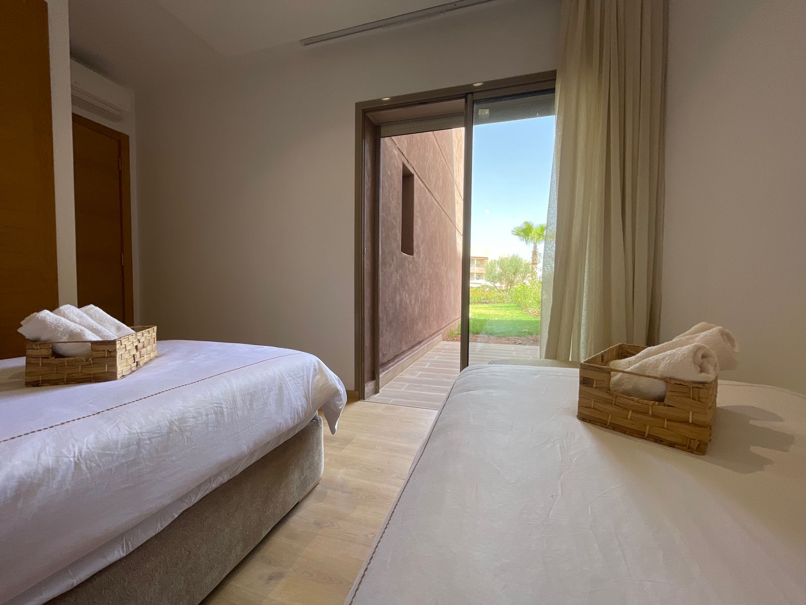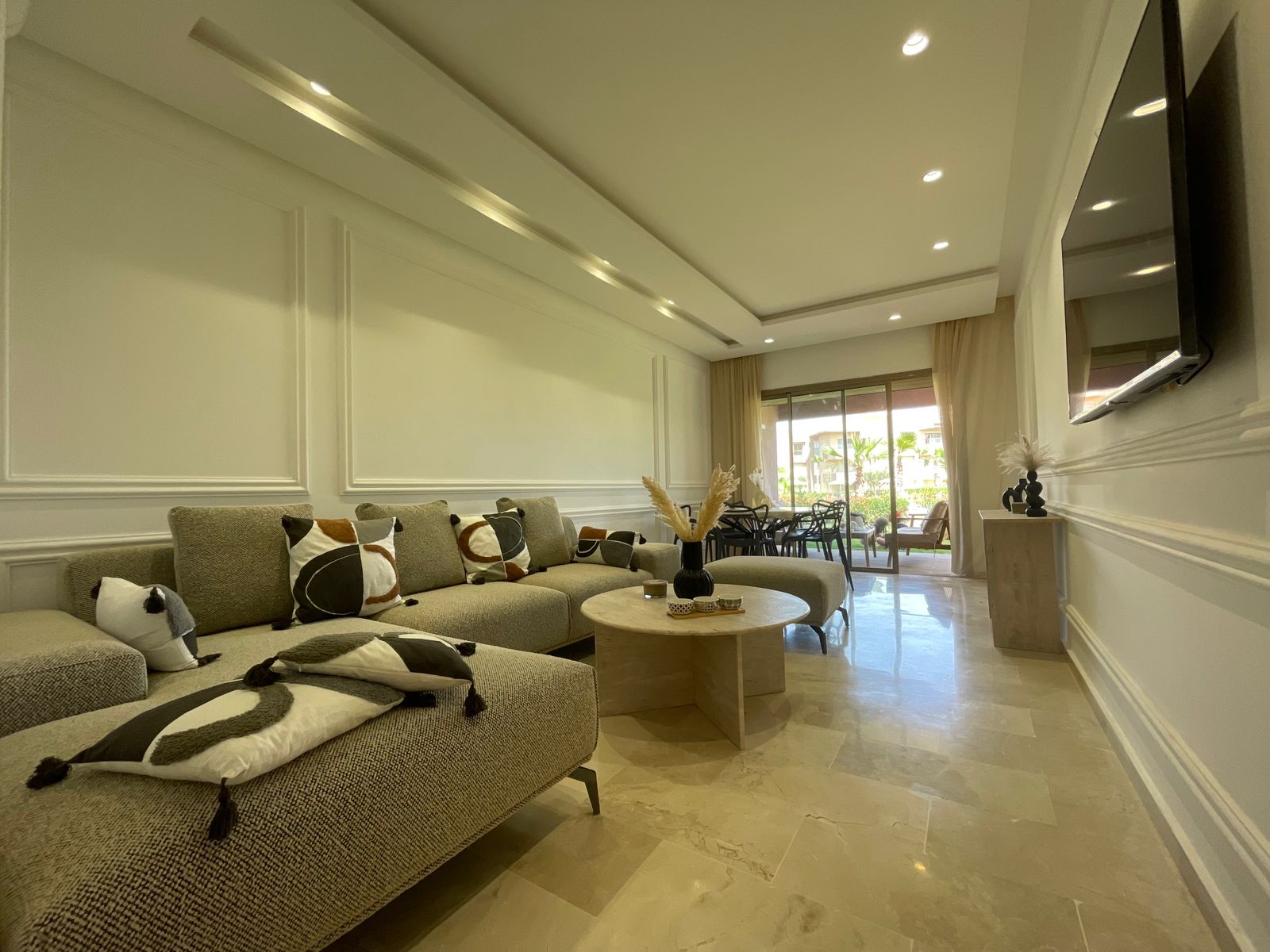 Bel appartement moderne situé en rez-de-jardin dans la résidence sécurisée Prestigia – Entrée Saphir, à seulement 10 minutes du centre de Marrakech.