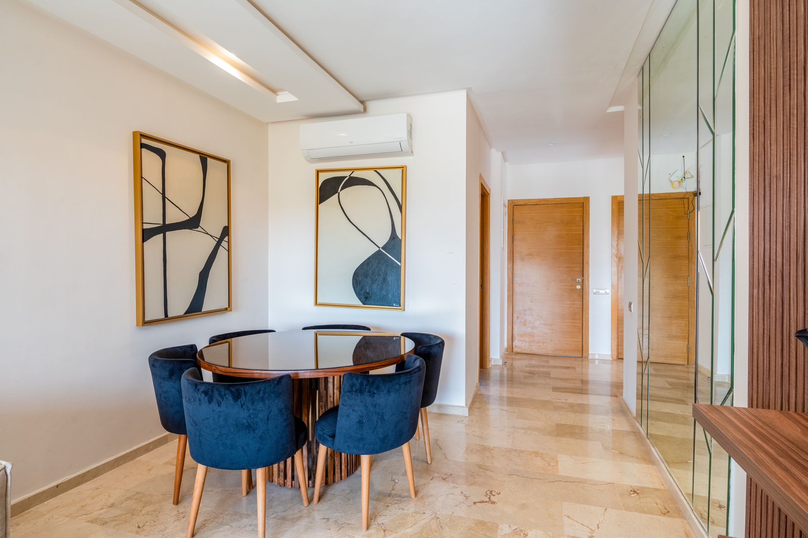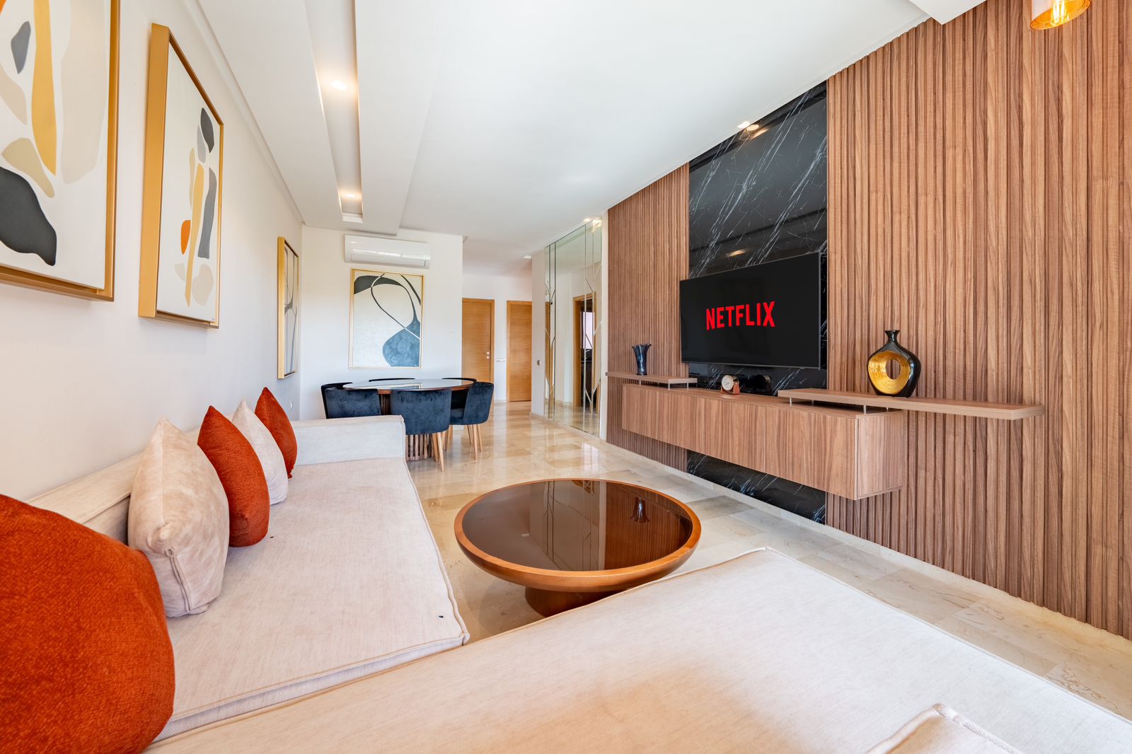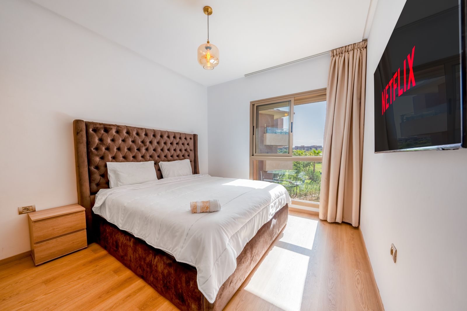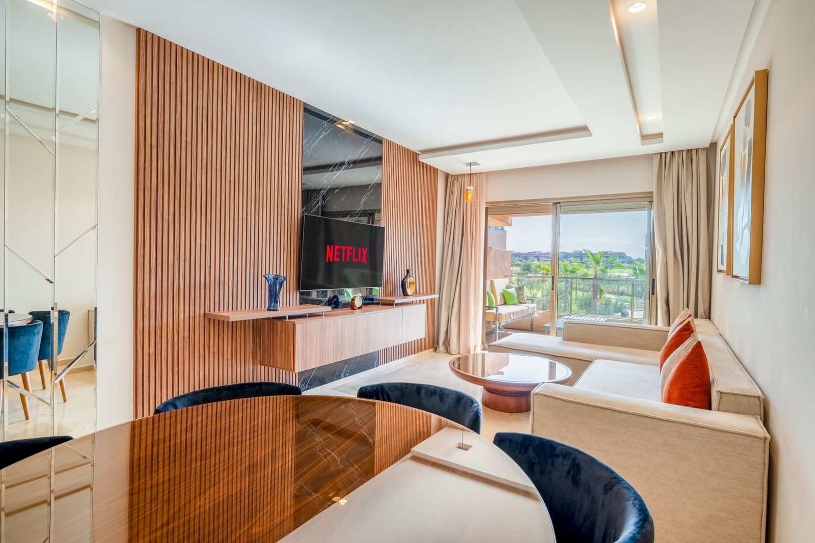 Magnifique appartement moderne situé au 1er étage de la résidence sécurisée Prestigia – Entrée Saphir, à seulement quelques minutes du centre de Marrakech.
