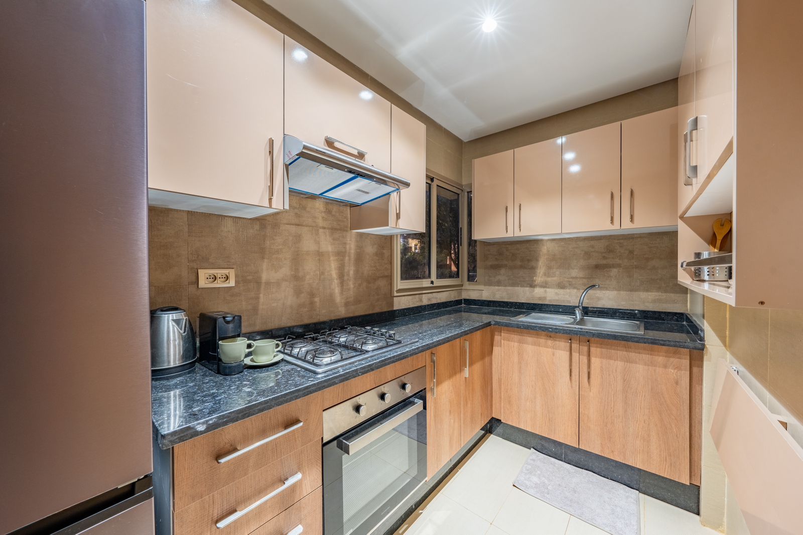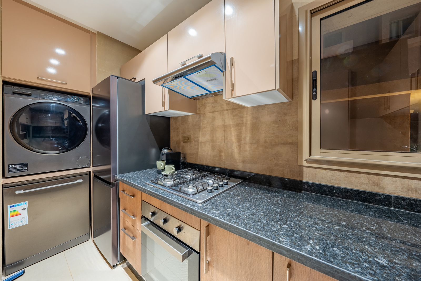 Four, plaques, grand réfrigérateur, machine à café et ustensiles complets pour cuisiner sereinement.